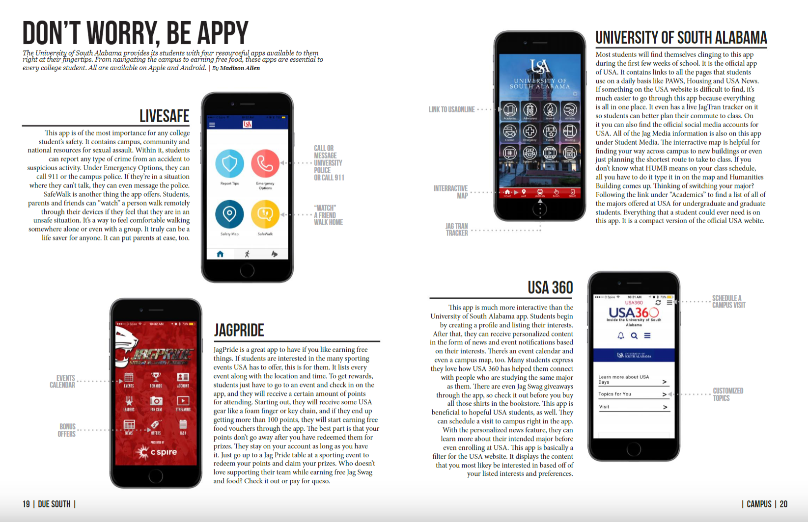 I was a part of Due South magazine from August 2017 - December 2021. Due South is the University of South Alabama's campus magazine and is entirely made up of students. Each semester I would write 1-2 articles. From January 2019 - December 2019 I served as the assistant editor so along with writing articles, I helped with the overall layout design and created graphics for the two issues published.