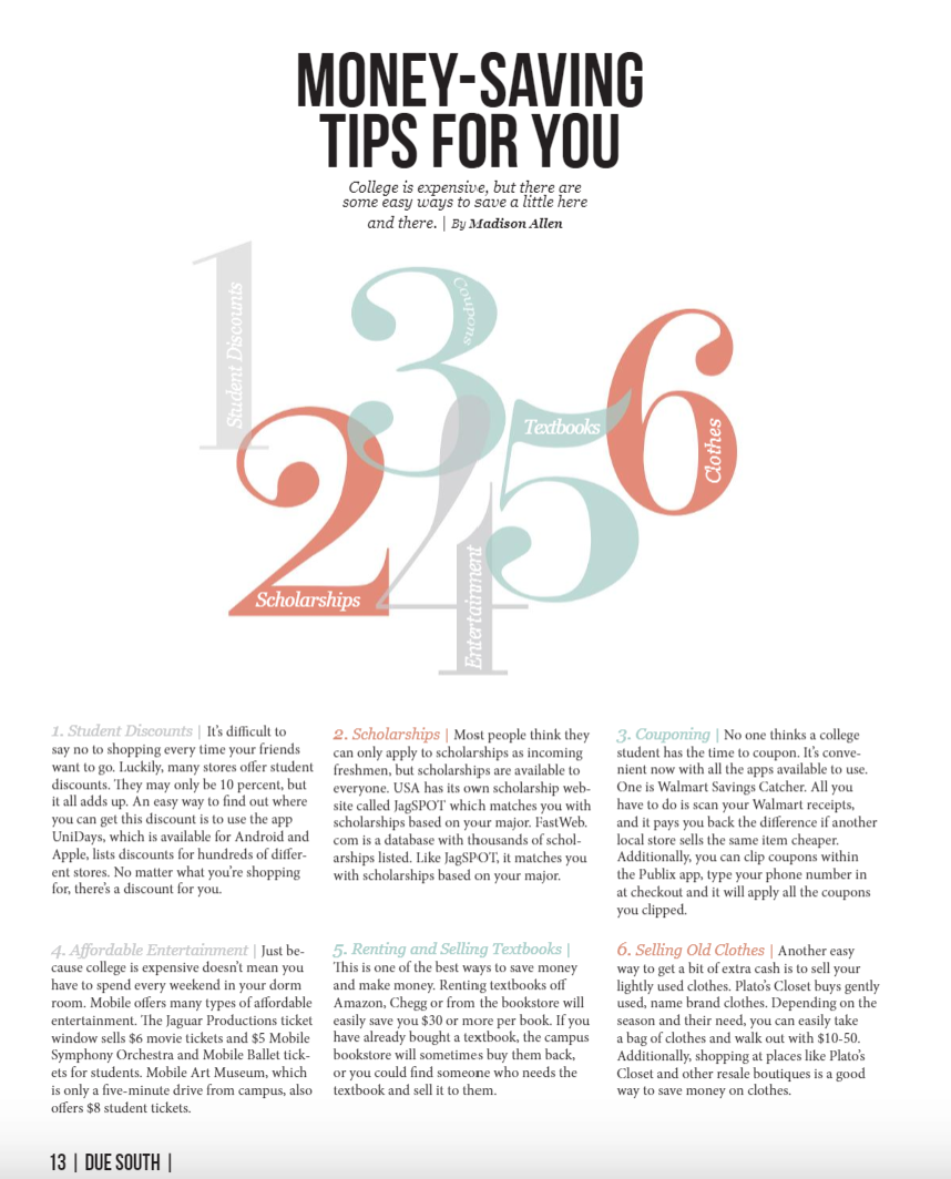 Article for Due South for the spring 2018 issue. Just simple money-saving tips for college students.